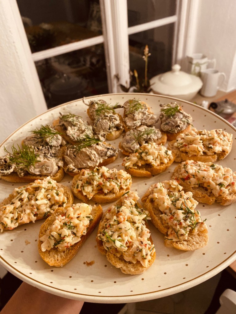 The following day we hosted a dinner party, and mum and I both cooked making it so easy. I had prepared the crostini we had with some bubbly when our guests arrived. We had the Finnish-Russian mushroom spread and the Öjeby toast – both delicious!