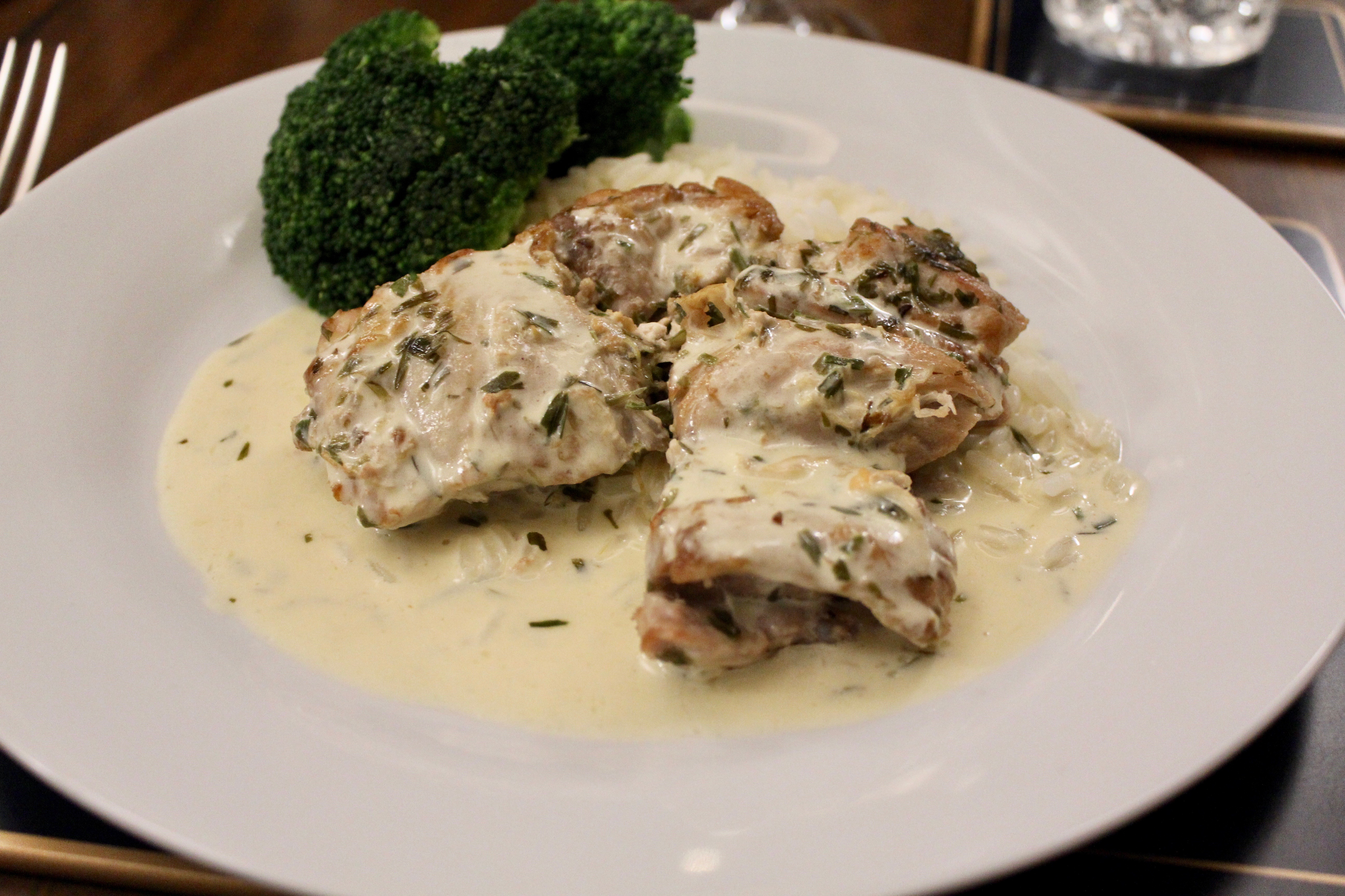 Pour the oil into a medium saucepan. Heat to medium temperature and add 1 tsp tarragon. Cook for a minute then add the chicken thigh fillets, smooth side down on top of the tarragon. Cook for 5 minutes, then turn the chicken and add the wine and salt. Lower the temperature to a simmer and put a lid on the pan. Cook for another 10 minutes. Check with a knife to see that the thicken is cooked through, then remove to a plate and let rest while you finish the sauce. Turn the heat up to medium-high and add the cream and 2 tsp tarragon to the pan. Let it thicken slightly and adjust the seasoning. Serve with buttery rice and broccoli.