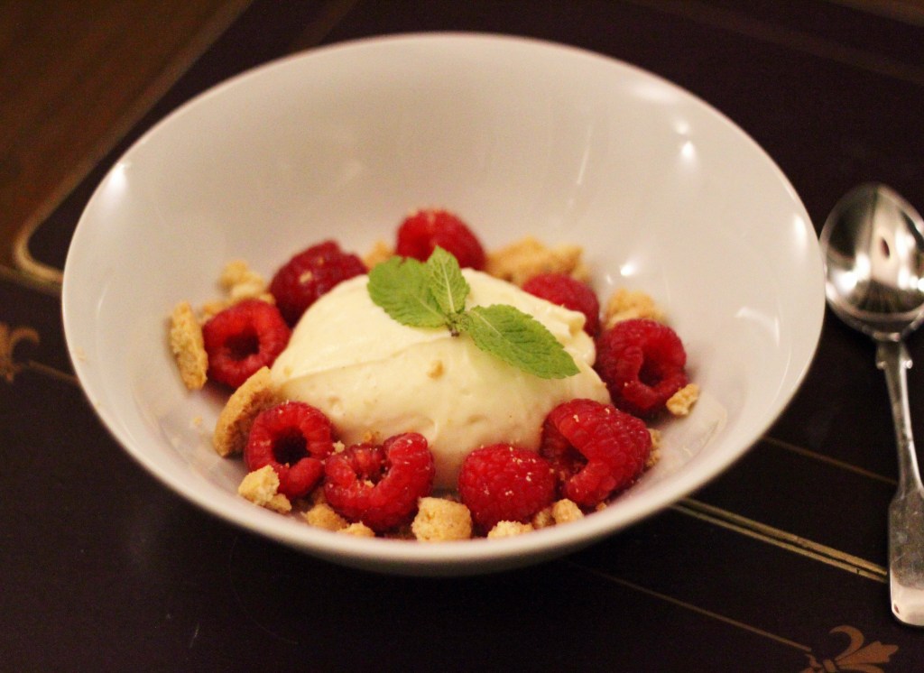 White chocolate crème with raspberries and biscuit crumbs, serves 4