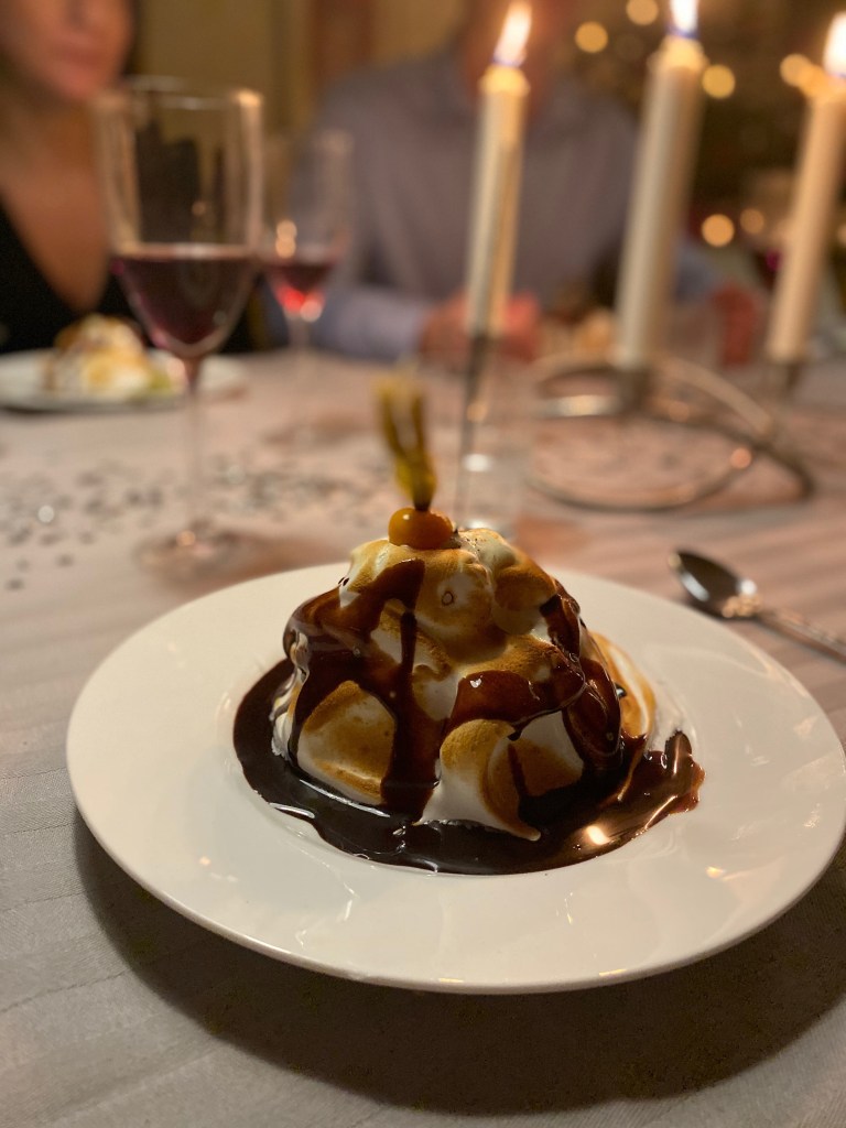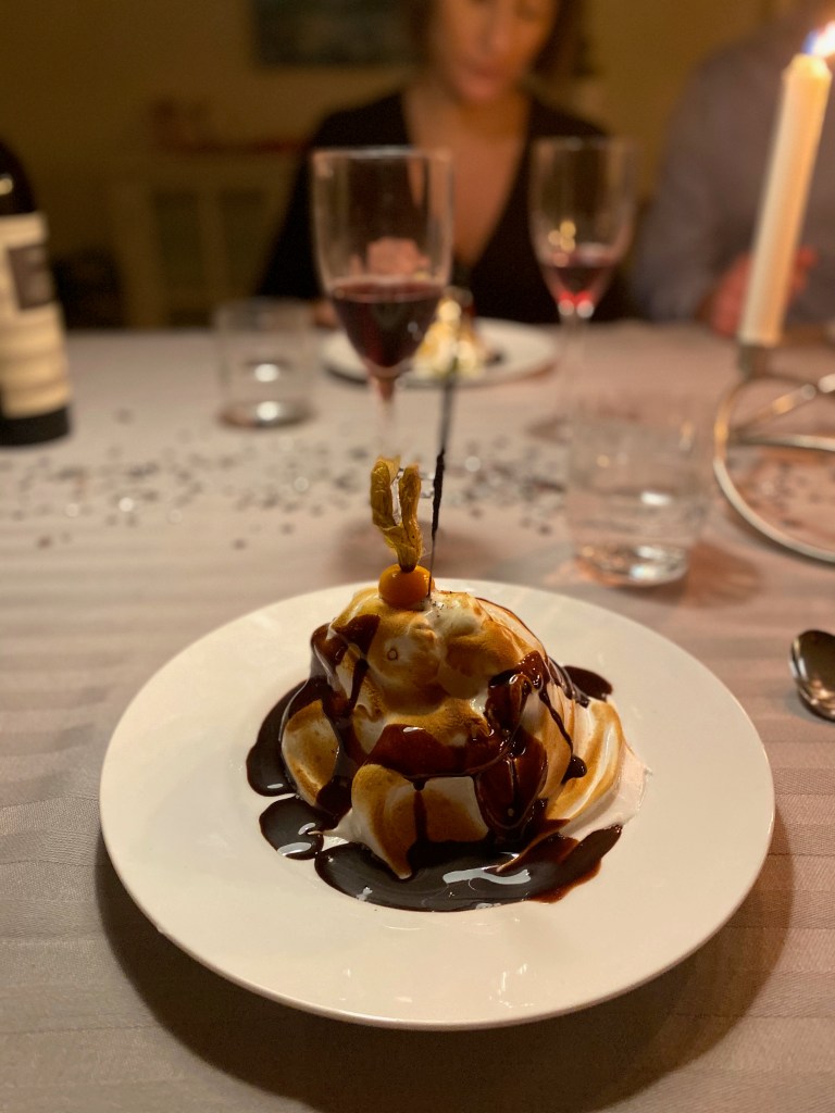 Baked Alaska with dulce de leche and vanilla ice cream and chocolate sauce, serves 4