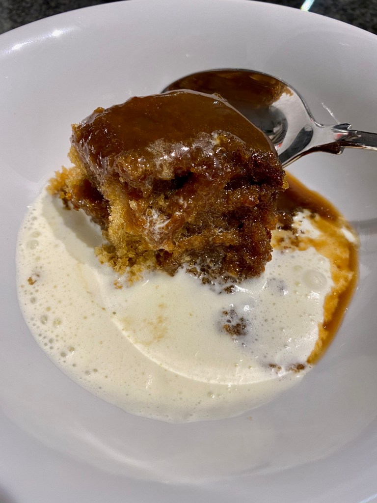 To serve, pour half the sauce over the pudding in the baking dish. Pour the other half into a jug to serve along side the pouring cream. Eat warm.