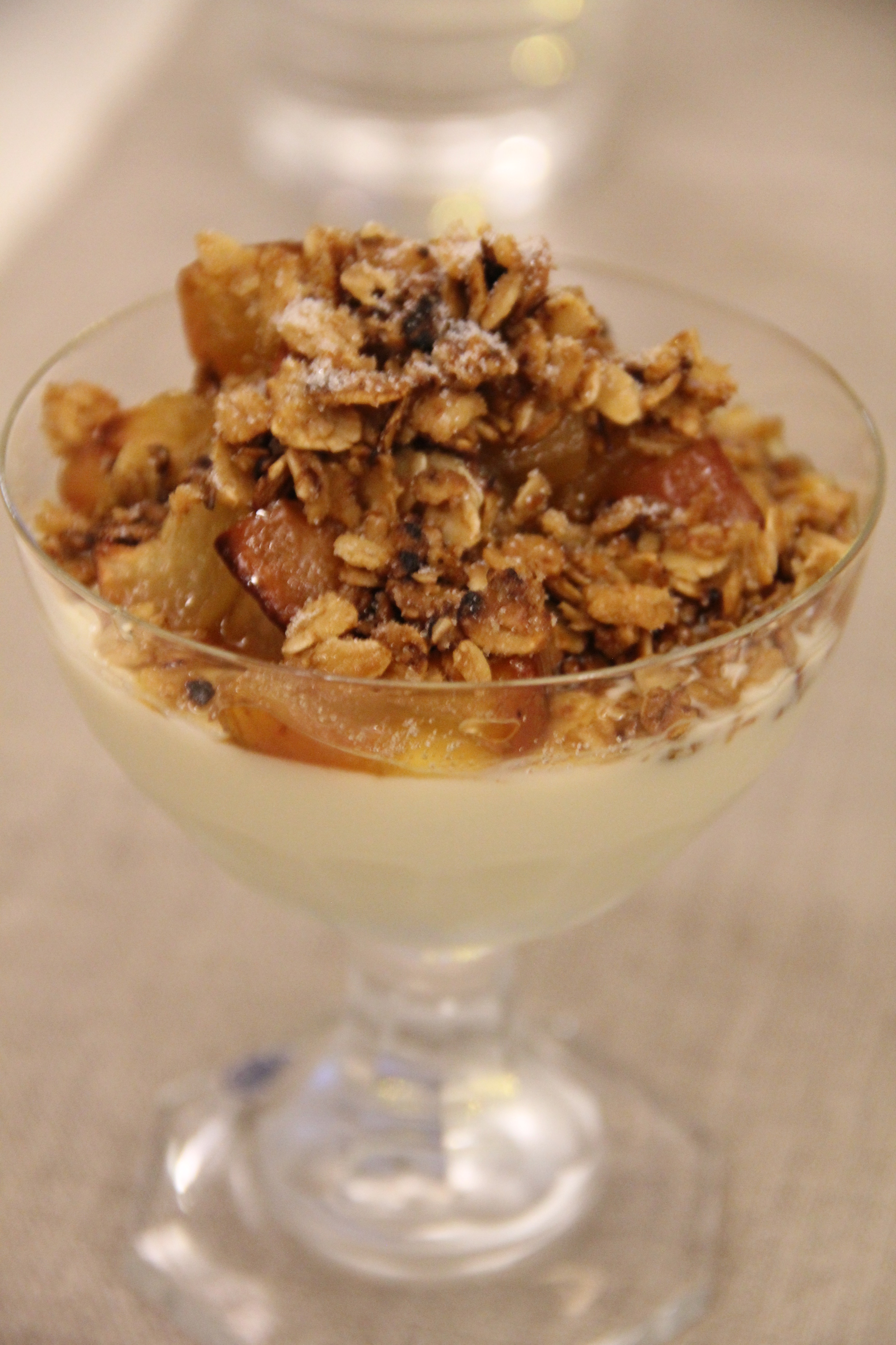 Vanilla pannacotta with fried apples and oat crumble topping, serves 4