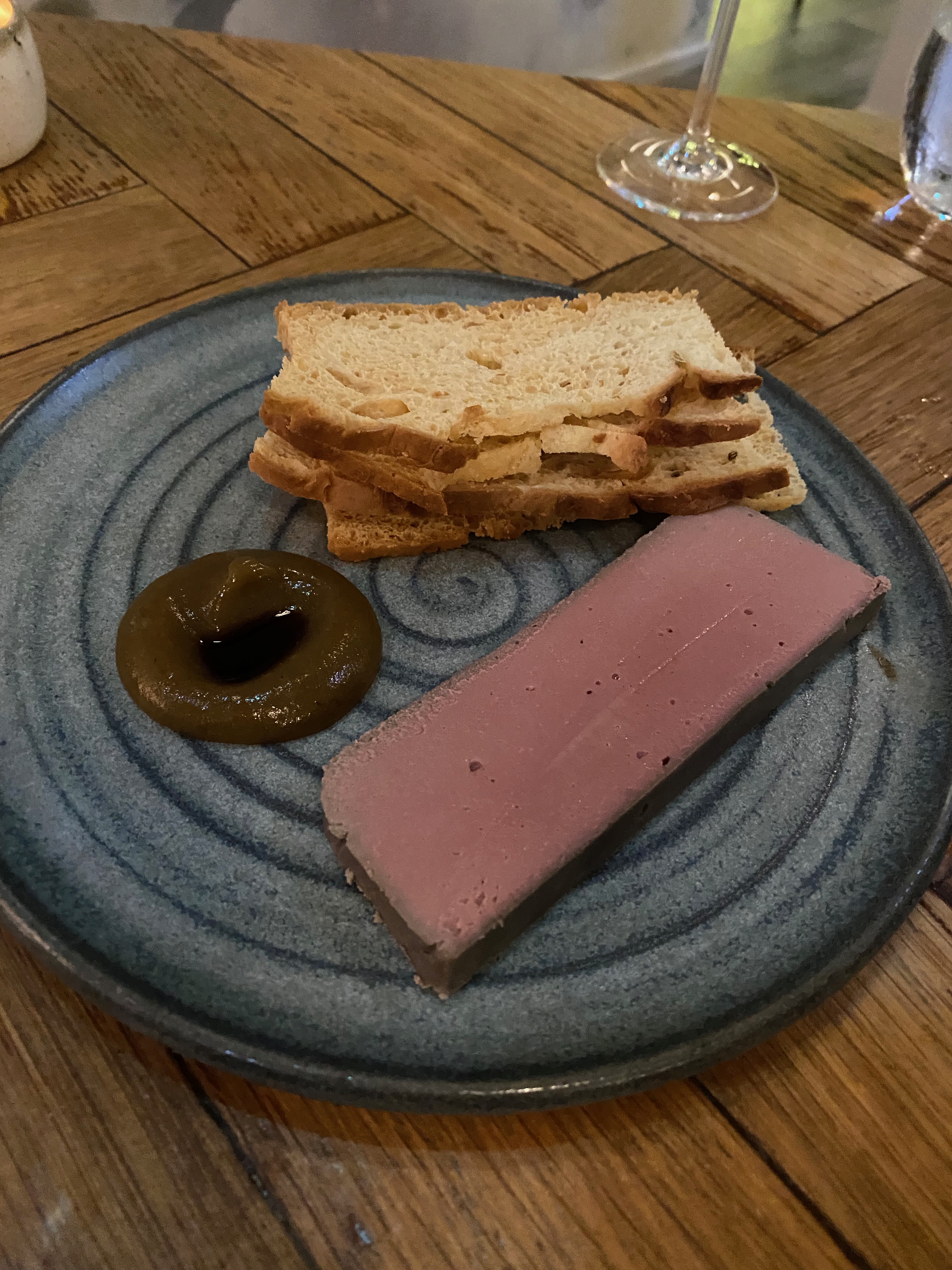 Our third dish was chicken liver parfait with toast, apple and port. This was very good, but didn’t stand out as much as the other two dishes. I really liked that the toast was the same focaccia we had to start, but probably from the day before and toasted, so it was used up. The apple sauce had a well of reduced (?) port in the middle which was really lovely with the parfait.