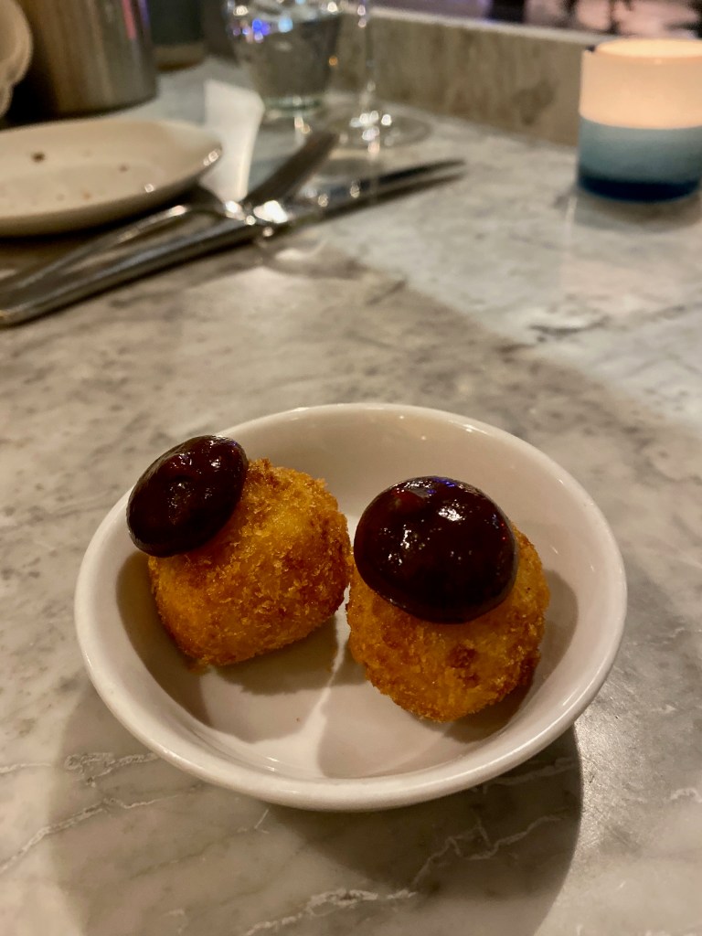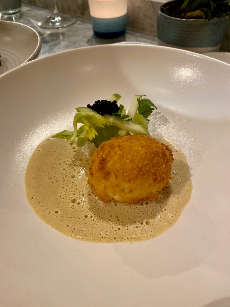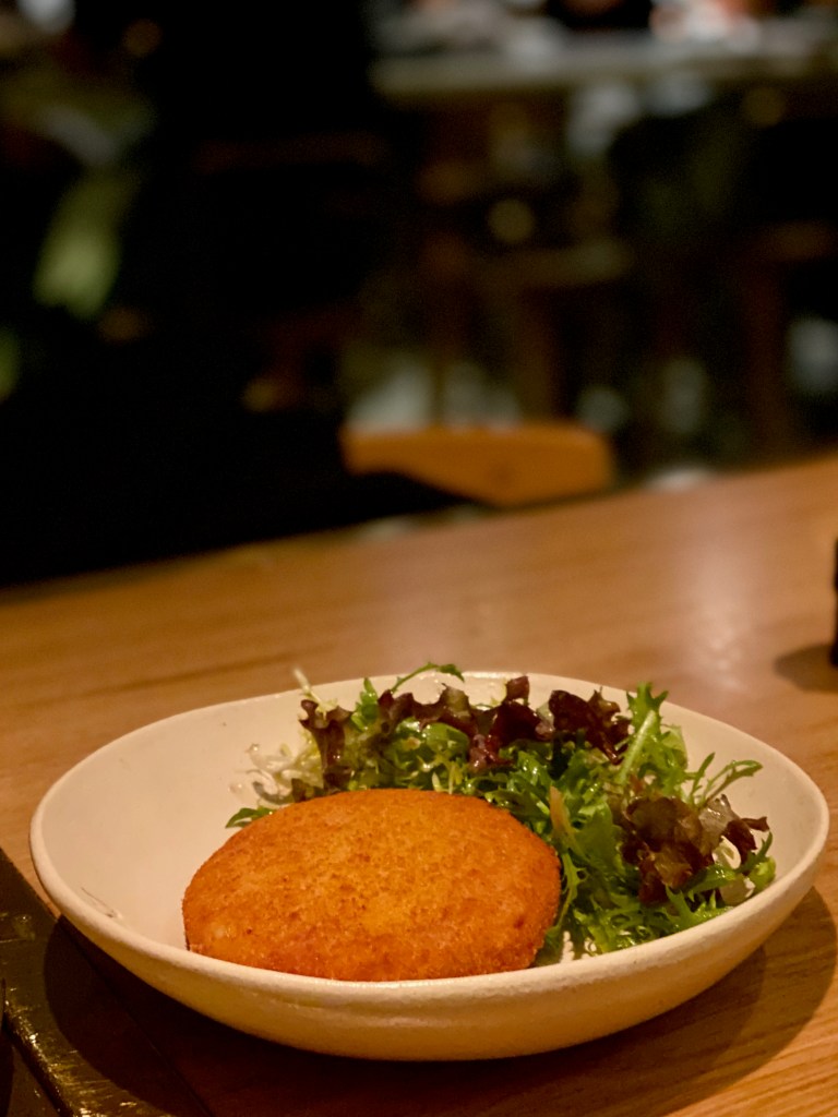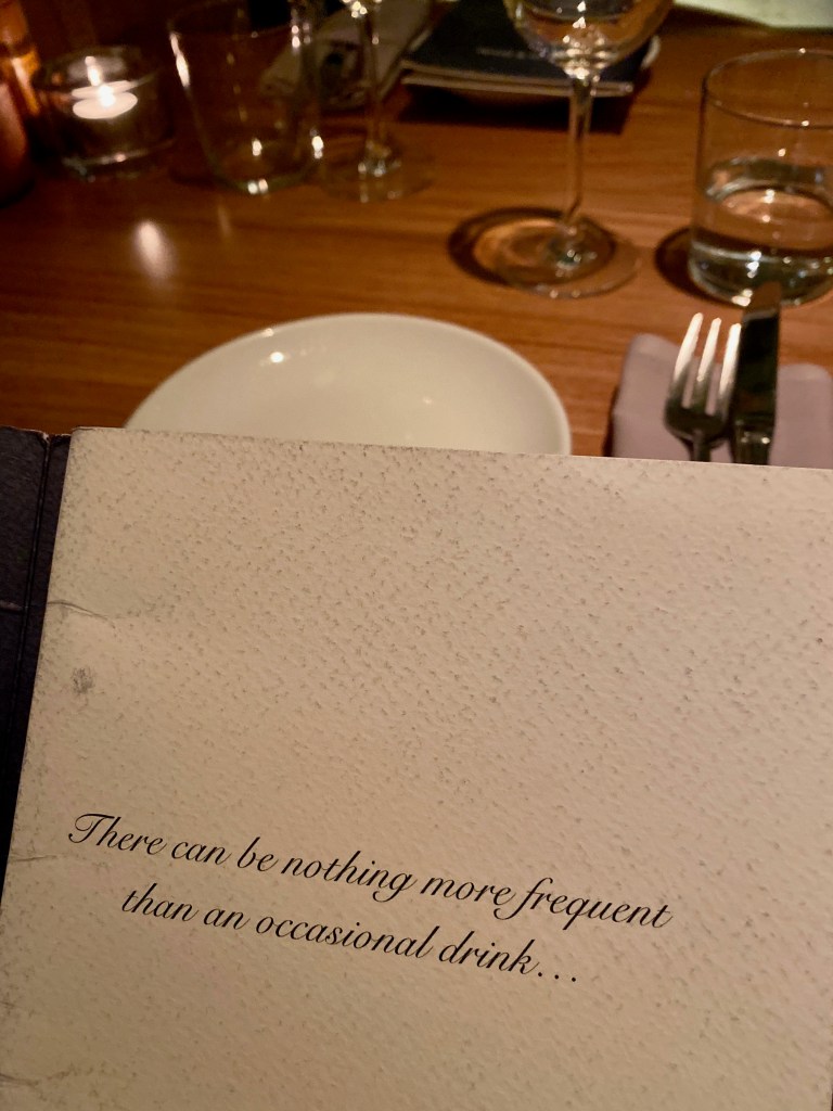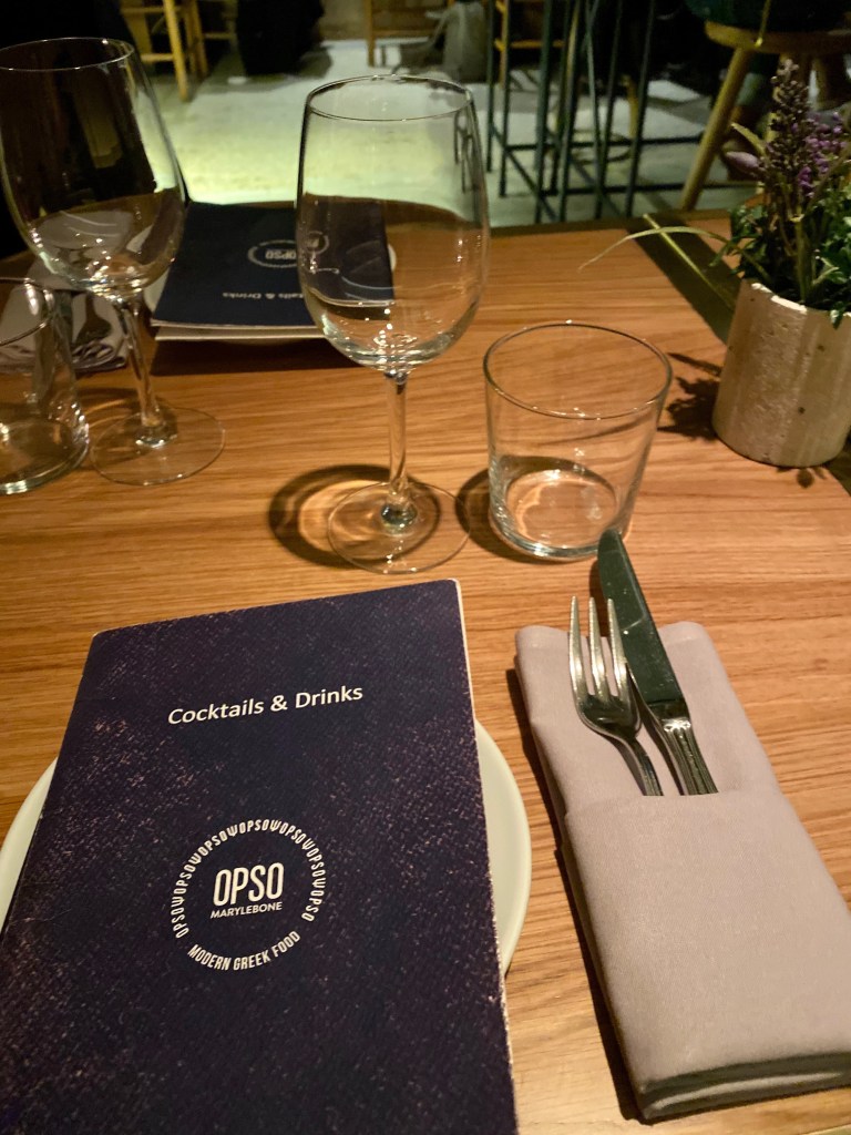 So when Gaby and I arrived at OPSO we took our time and studied the menu properly. And the wine list, which had the funniest wine descriptions in it, and checked out the whole space. The airy interior and mix of high and low tables felt more New York than London, but in the best possible way, and I really liked the modern Greek food idea. I adore Greek food (despite never having been to Greece, which I need to remedy as soon as we can all travel again) but there aren’t many high-end or modern places around where you can sample it.