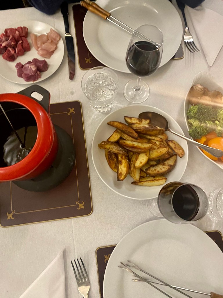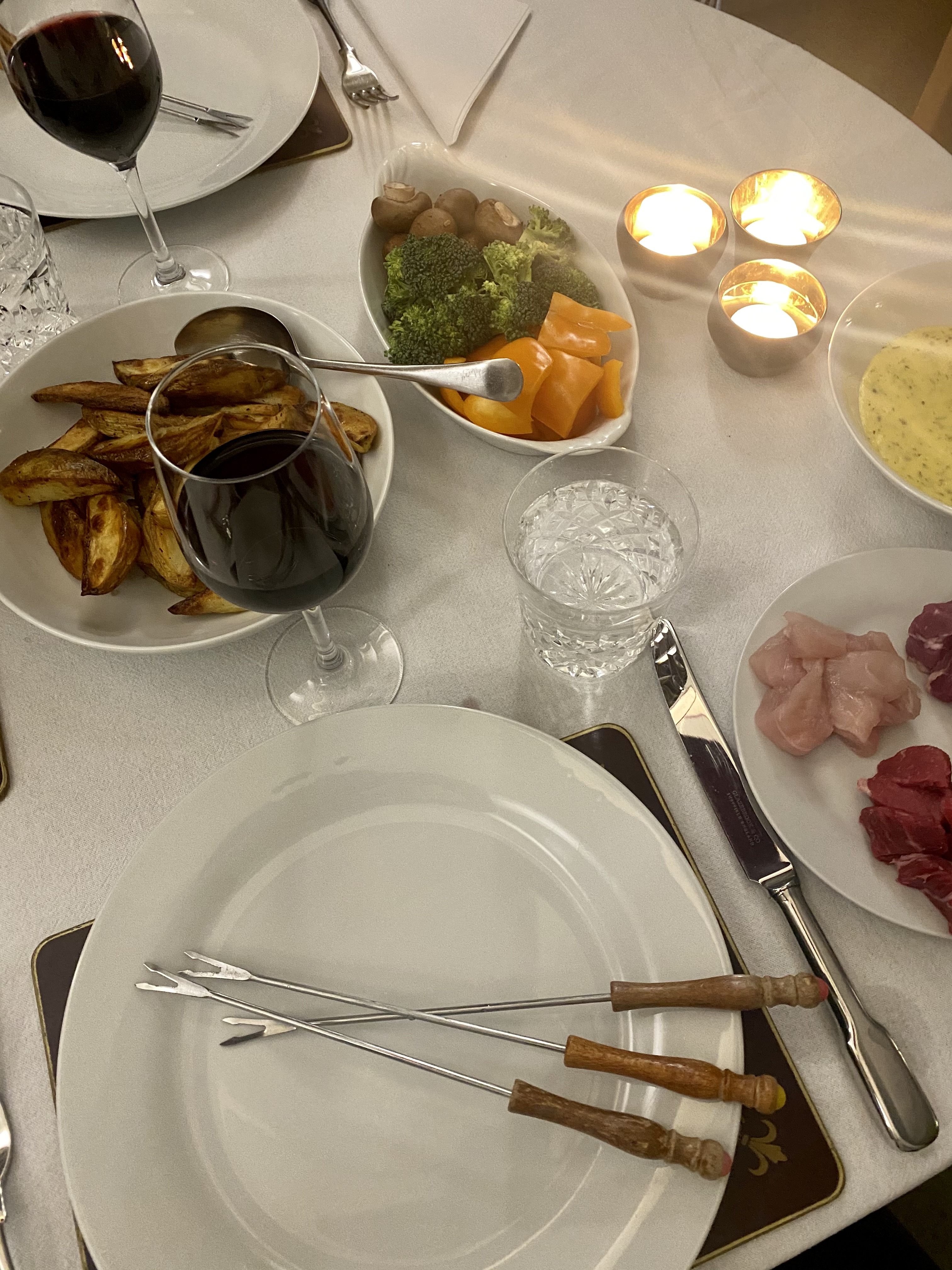 Fondue pot, fuel and oil: We used one fondue pot for two people, but for four people I would recommend two pots if you have, as it gets crowded otherwise and the meat doesn’t cook as fast. I ordered gel fuel from Amazon which worked so well and felt easier to handle than liquid fuel. It also didn’t smell very much. Most important with oil is that it’s one that can take high temperatures, like vegetable oil, warm pressed rapeseed oil or groundnut oil. I also heat it up properly on the stove first and then transfer it to the fondue pot, so it’s warm to begin with. I recommend three forks (or maybe even four) per person, with two it’s a bit too slow, especially if you cook the vegetables too.
