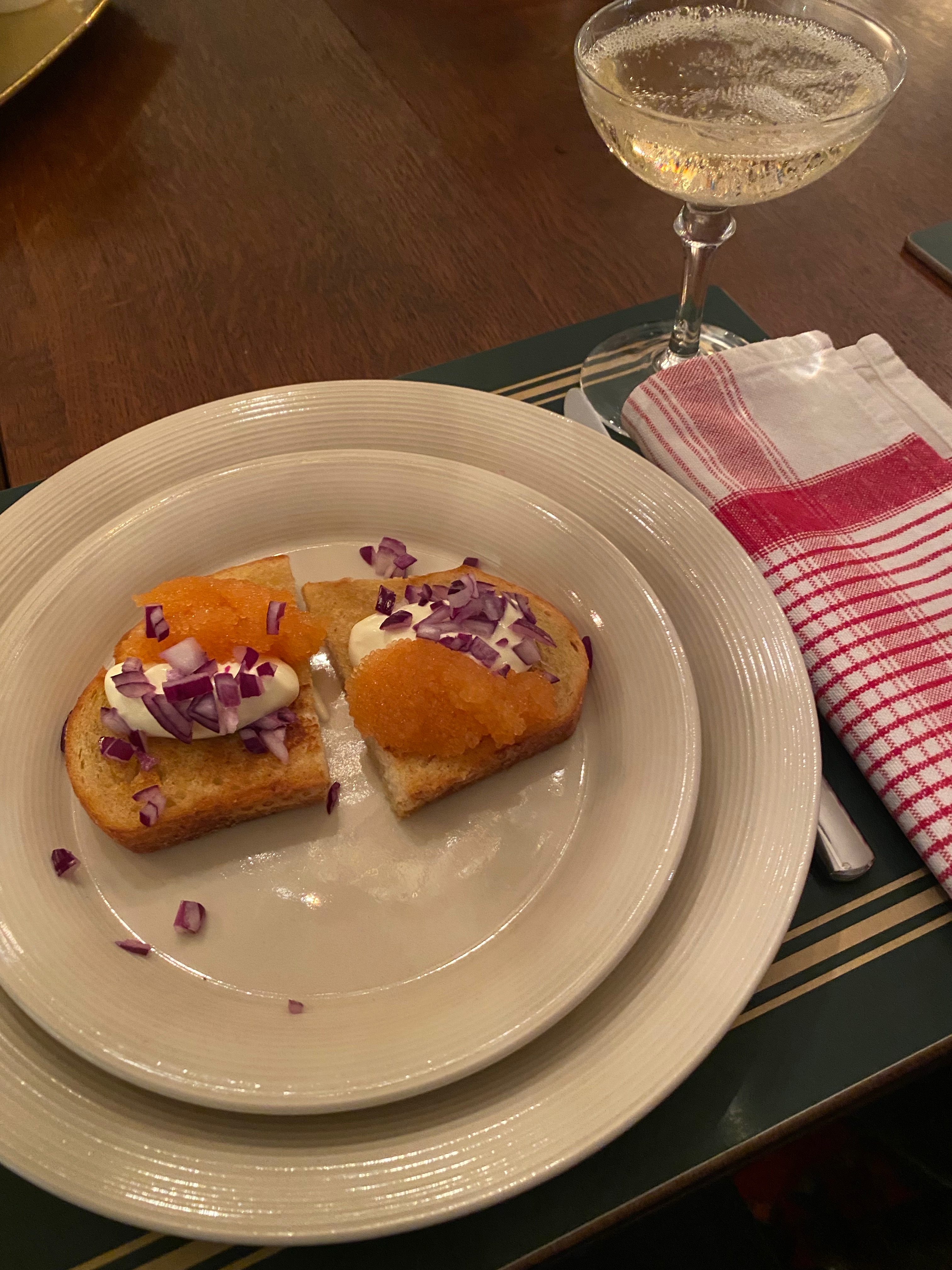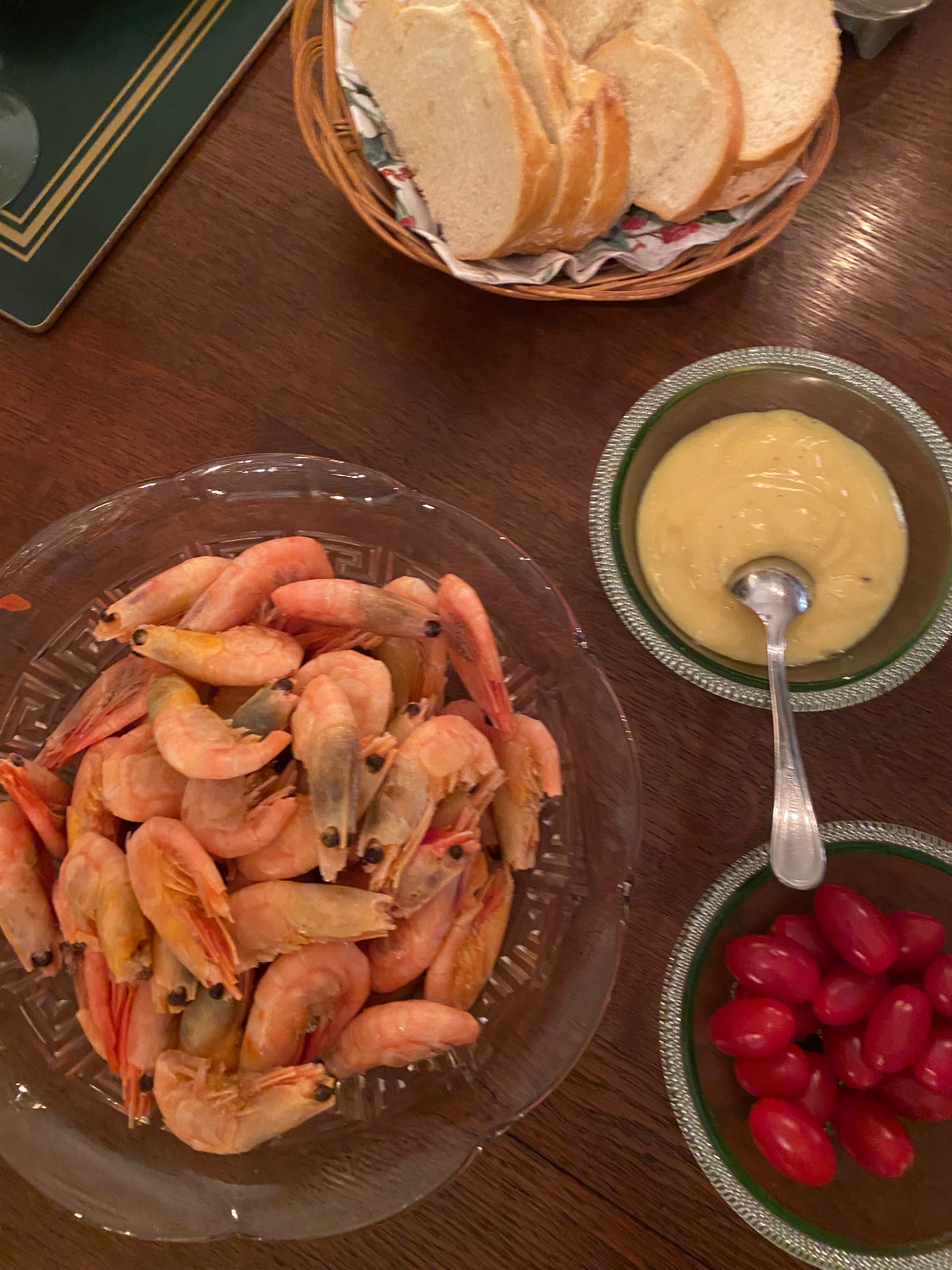 But we also indulged in the foods we love, like bleak roe toast and prawns! And pudding!