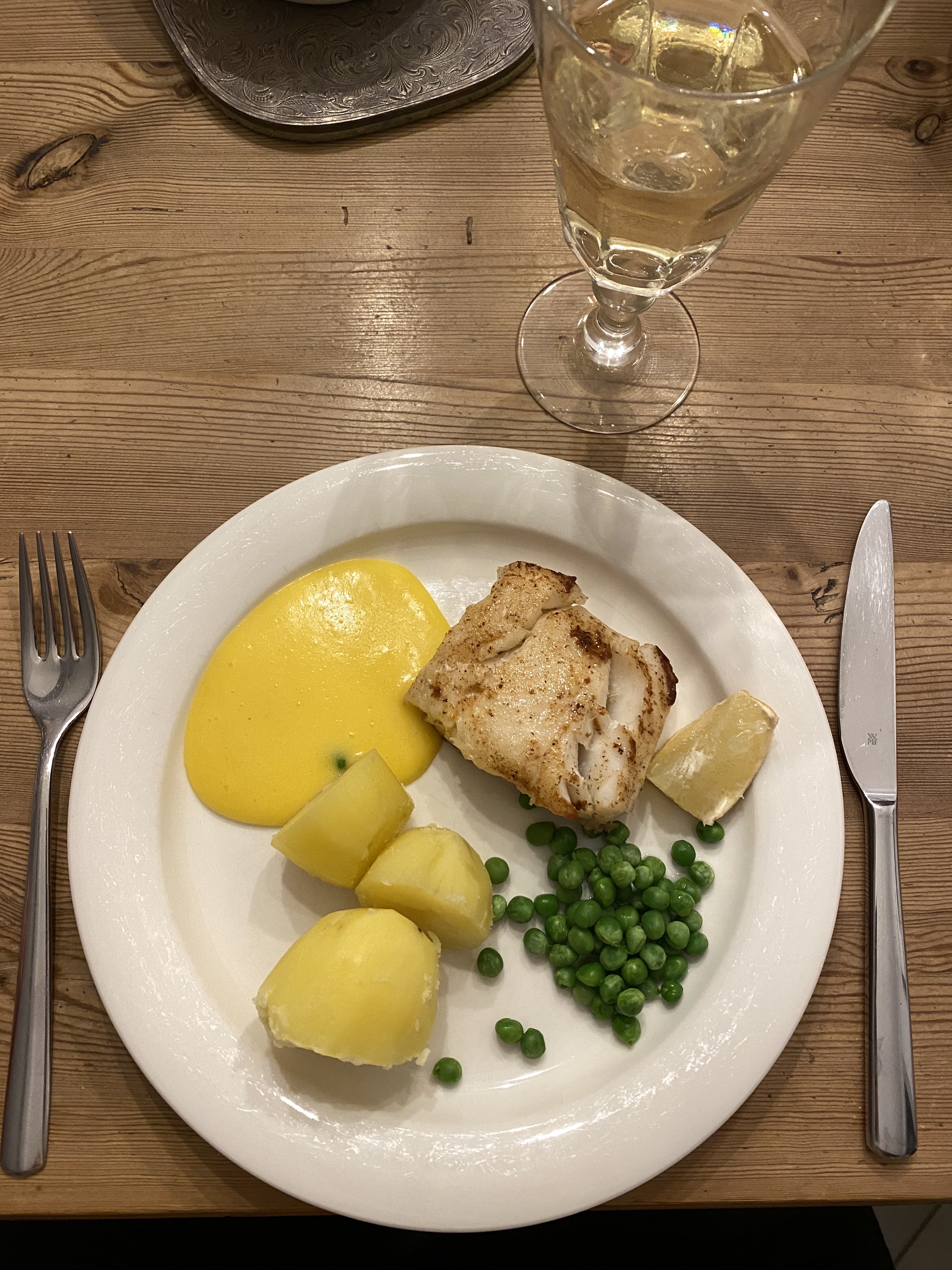 We had turbot for dinner, cooked whole in the oven, with potatoes, the most delicious sauce, peas and mange tout.