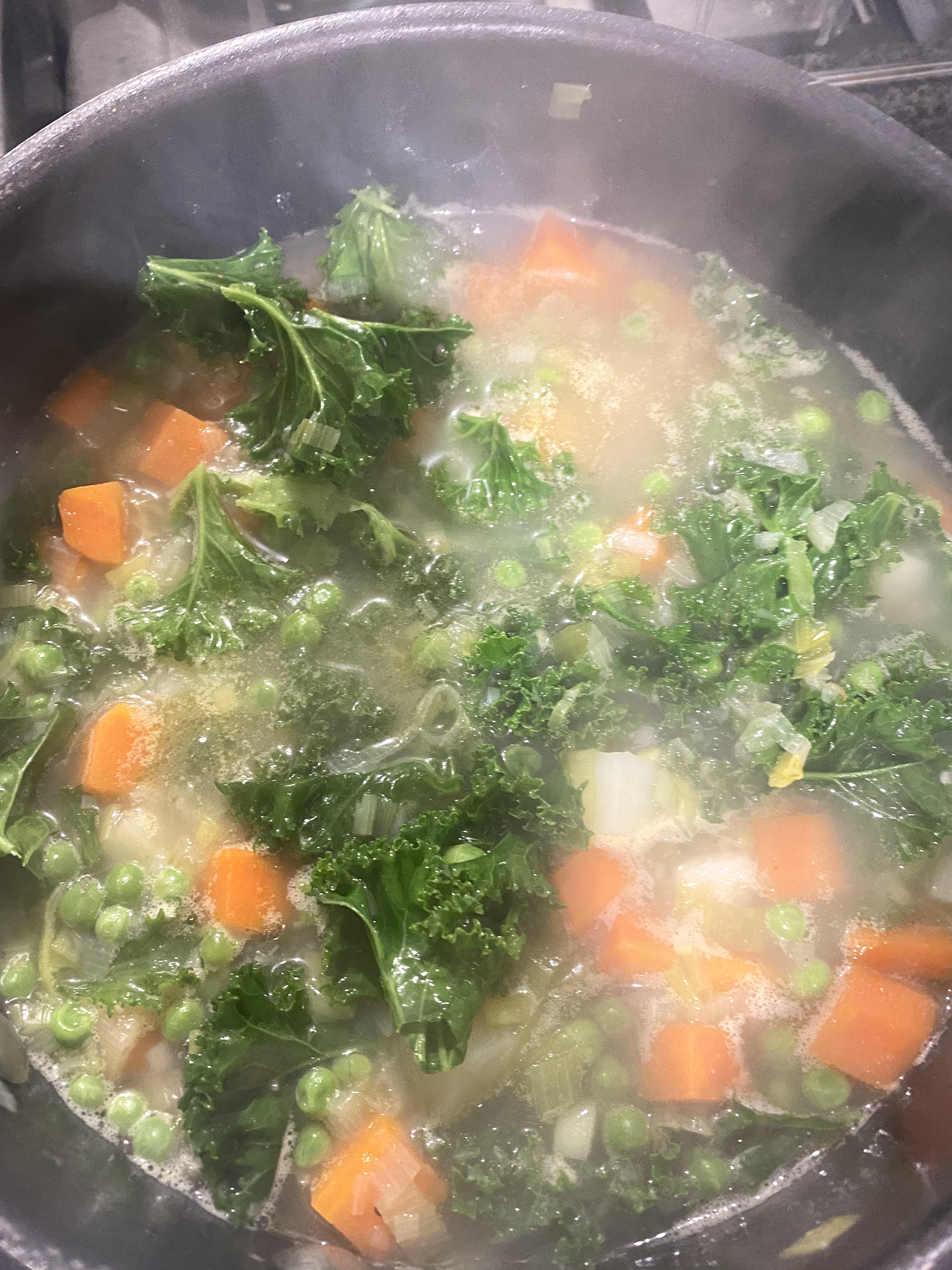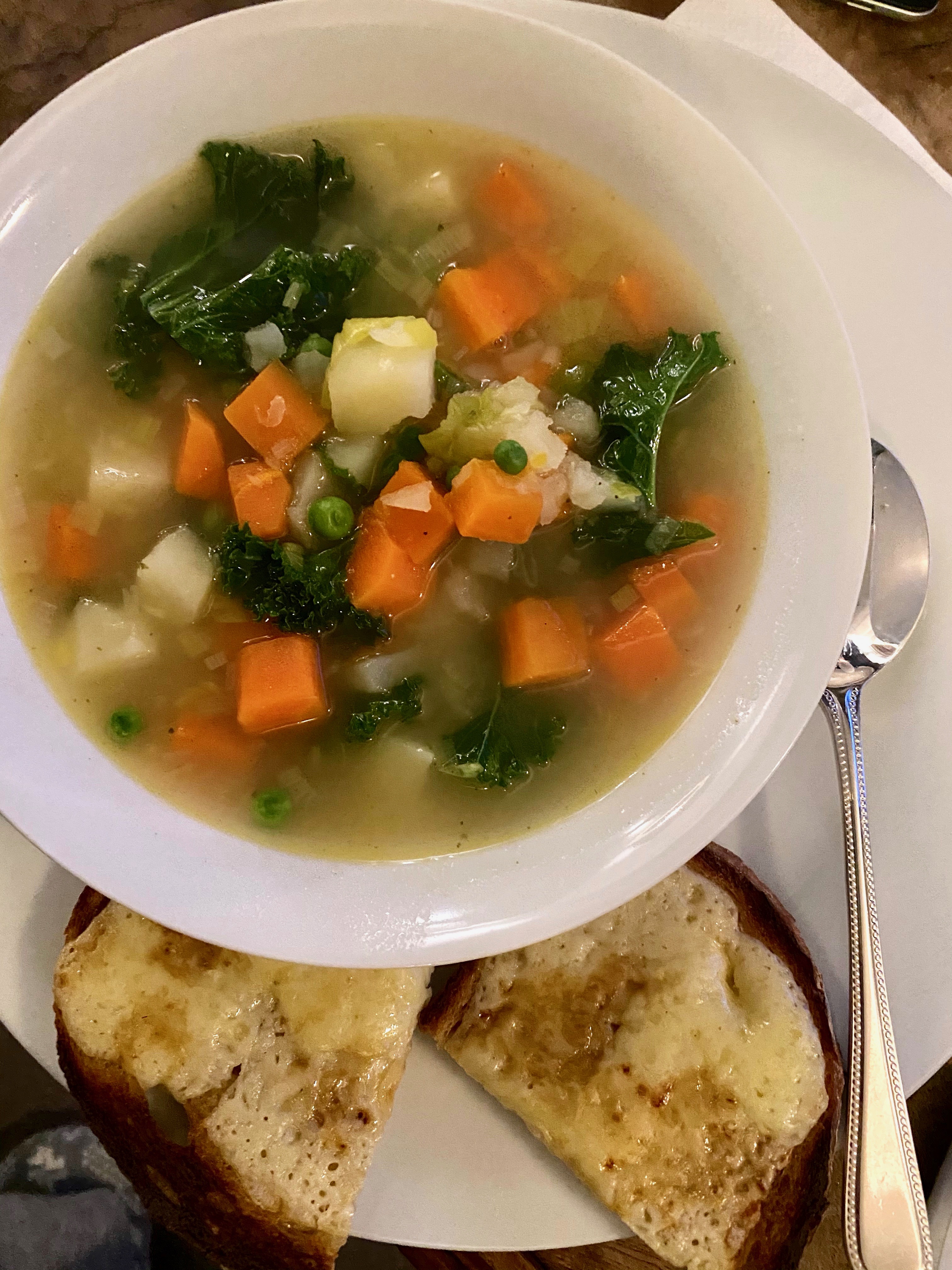 I started with softening some leeks, then adding carrots and potatoes, cubed small, and cooked until almost soft in homemade chicken stock. Then I added the kale and peas and adjusted the seasoning and removed the bay leaf. It’s probably the most classic vegetable soup there is, and each family have their own version. It’s similar to French pot au feu and the addition of pesto or pistou when serving would work really well. Or just eat it plain tasting each vegetable as it hits your tongue.