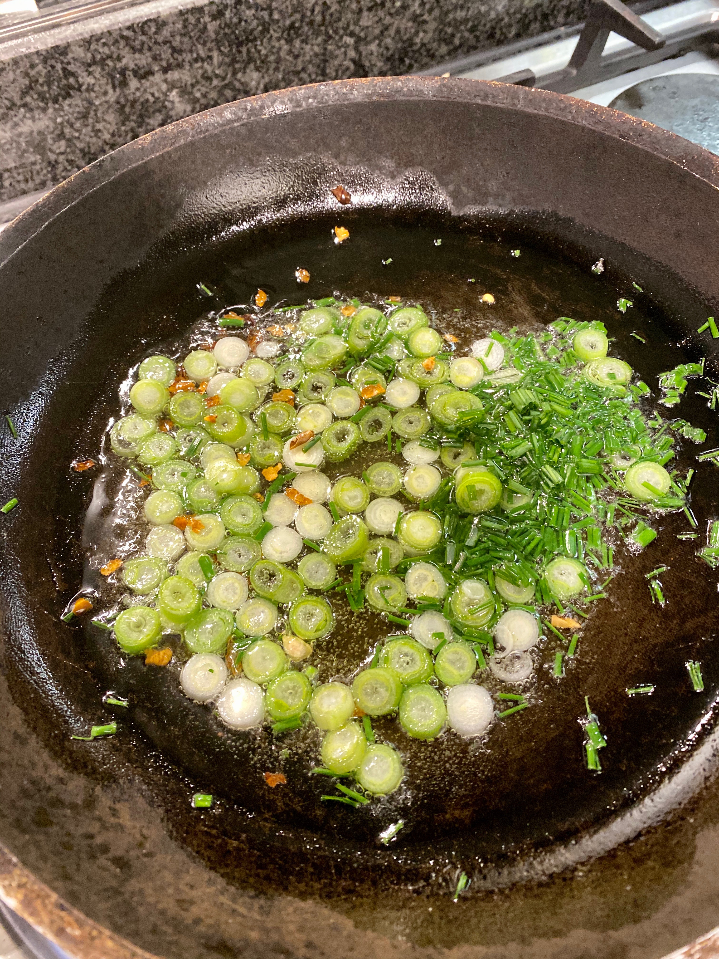 Heat the olive oil, spring onions, chilli flakes and coriander in a small pot over medium-low heat. Cook, swirling occasionally, until the scallions and red-pepper flakes start to visually and audibly sizzle and frizzle and turn the oil a bright, fiery orange. Remove from the heat, and let cool enough to taste without burning your mouth, then season with salt and pepper.