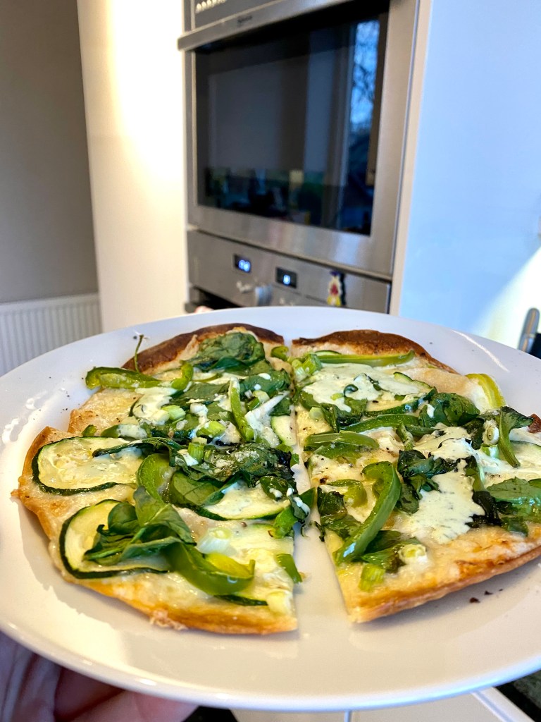 Place the two tortillas on a baking tray. Spread the creme fraiche onto the tortilla and scatter with cheddar. Add a little salt and pepper before adding the vegetables with the spinach and spring onions on top. Add more salt and pepper and drizzle with olive oil. Bake in 220C oven for 5-10 minutes. Add a few spoonfuls of green tahini yoghurt dressing to each pizza and serve.