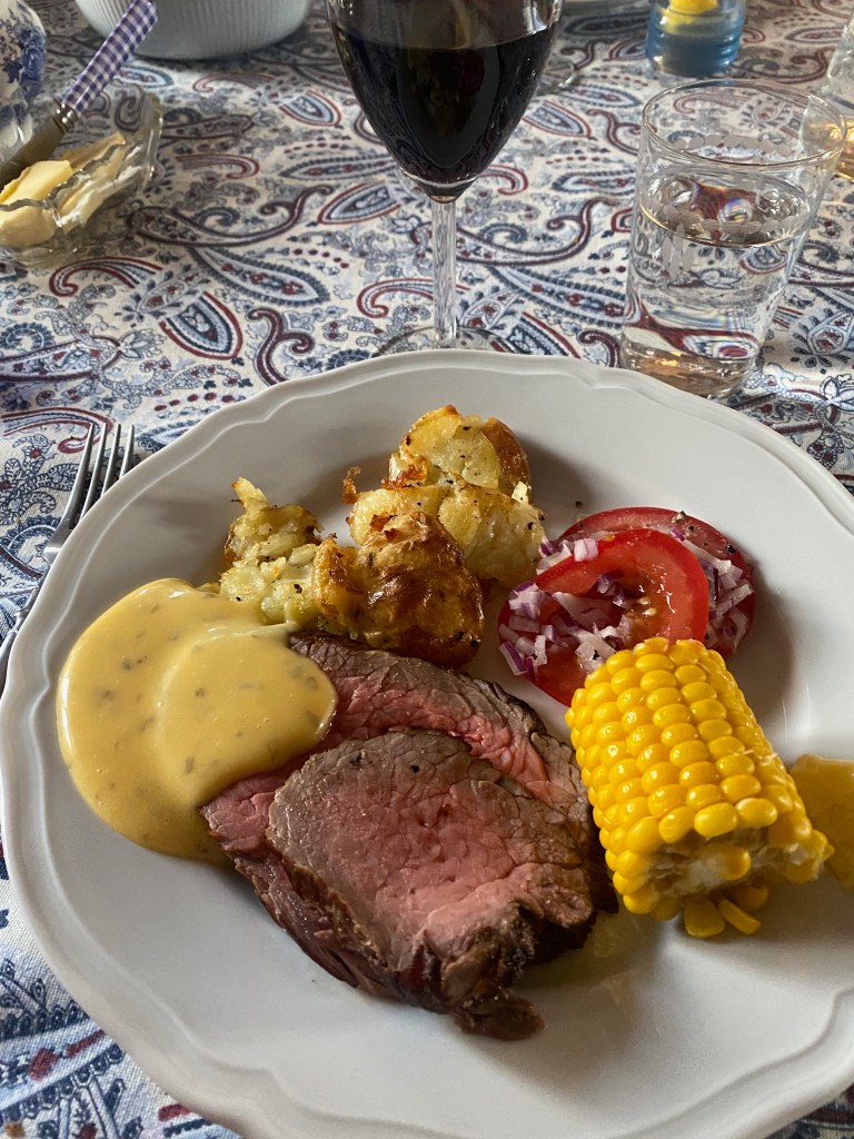 Then we’re going straight for the main course; fillet of beef, crispy potatoes, nice vegetables and a creamy mushroom sauce to bring it all together.
