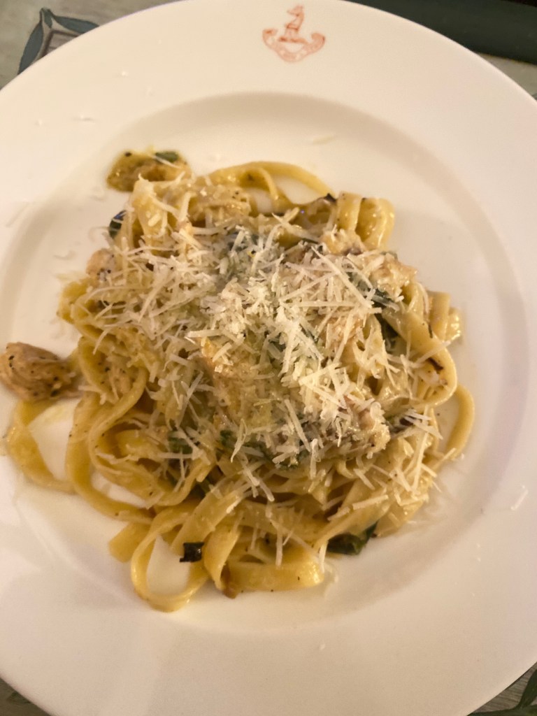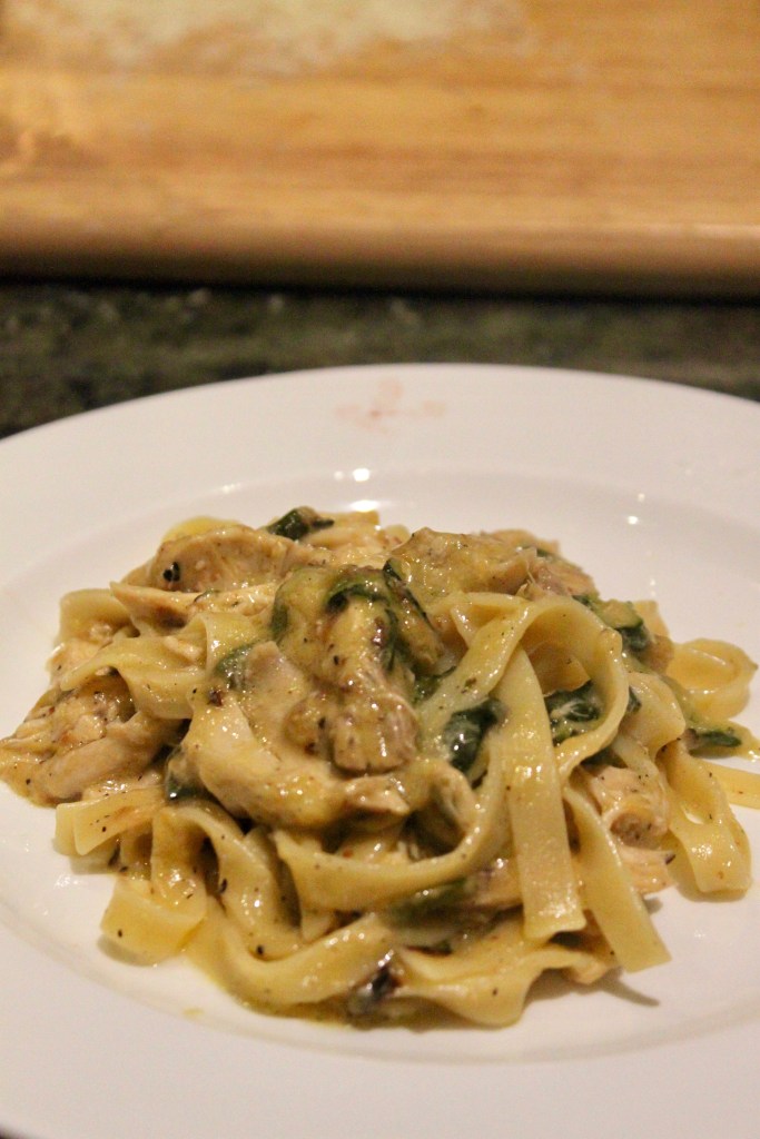 Creamy chicken and mushrooms pasta with spring onions, serves 2