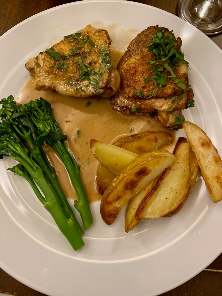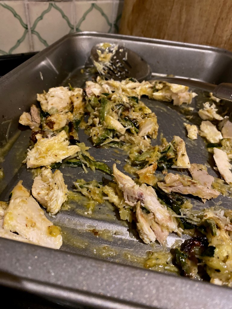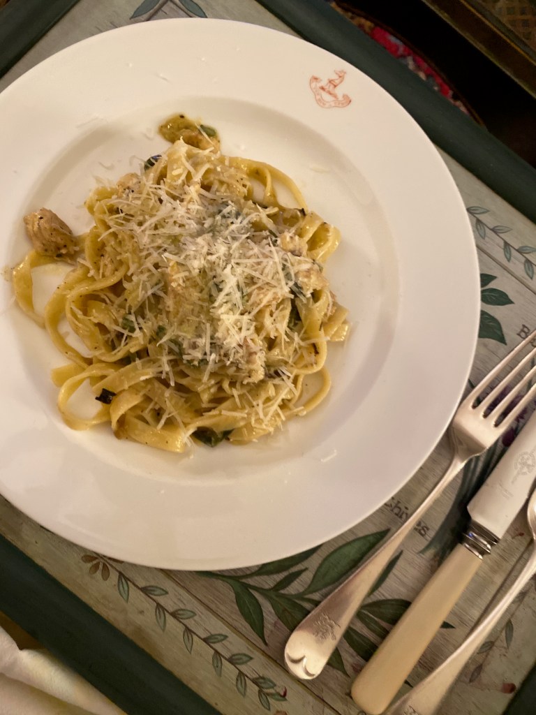 There are so many aspects of a roast chicken supper that I like. That the golden roasted bird with herbs, lemon and butter pairs fantastically well with dauphinoise potatoes and is a real joy to eat is of course number one. But it’s also extremely satisfying that I can make stock from the bones to use for soup or stews. And that I can use leftovers for both sandwiches and (at least) another supper! You really can stretch a chicken quite far, especially if you’re frugal with the leftovers and use with pasta, as I explained in this post.