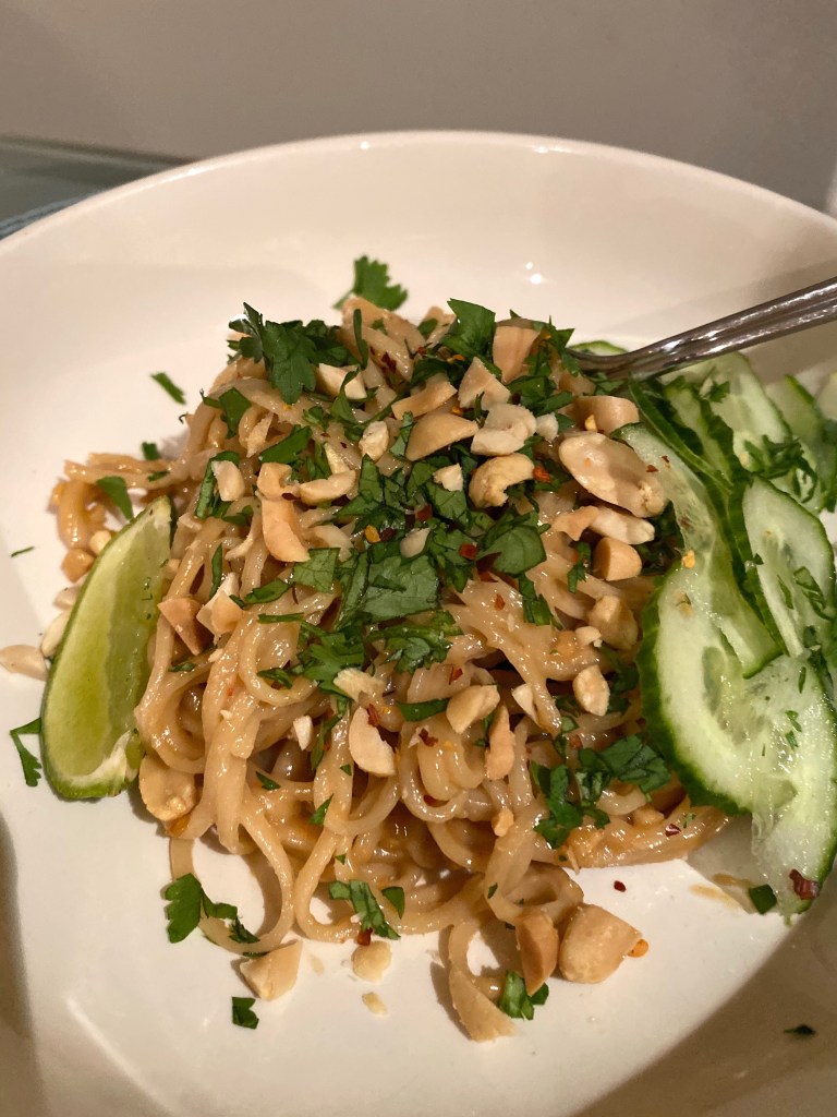 Nigella’s peanut butter noodles my way – with sliced cucumber, serves 4