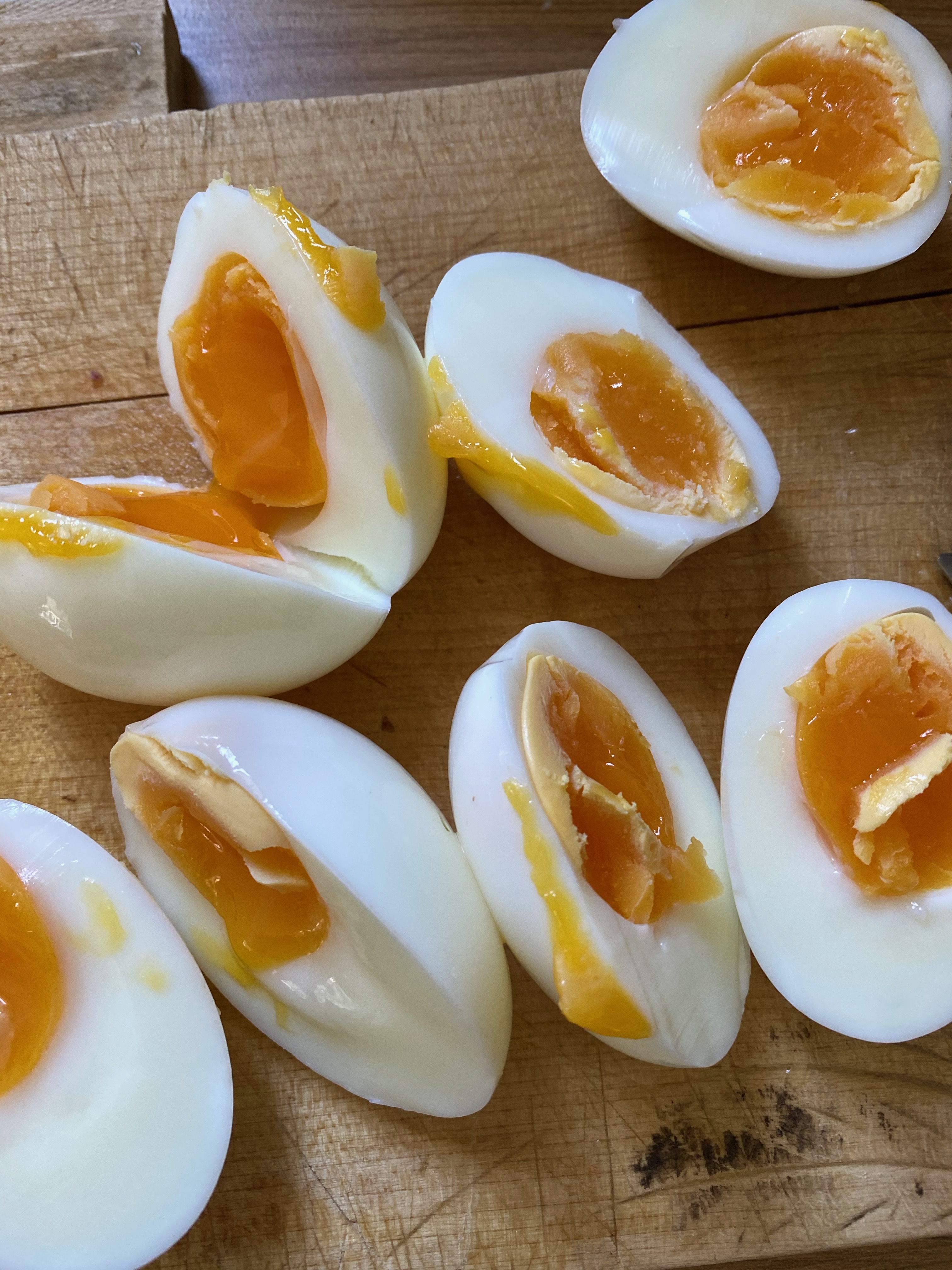 Start by boiling the eggs. Bring water to the boil in a sauce pan and submerge the eggs with a spoon one at a time. Cook for 6 minutes then drain and place the eggs in a bowl of cold water. Refresh with cold water after a minute or so. When the eggs are around room temperature, peel and chop them roughly. Mix mayonnaise, mustard, salt and pepper, lemon juice and chives in a bowl. Add the eggs, including all the runny yolk that’s spilled onto the cutting board. Mix well and adjust the seasoning if needed.