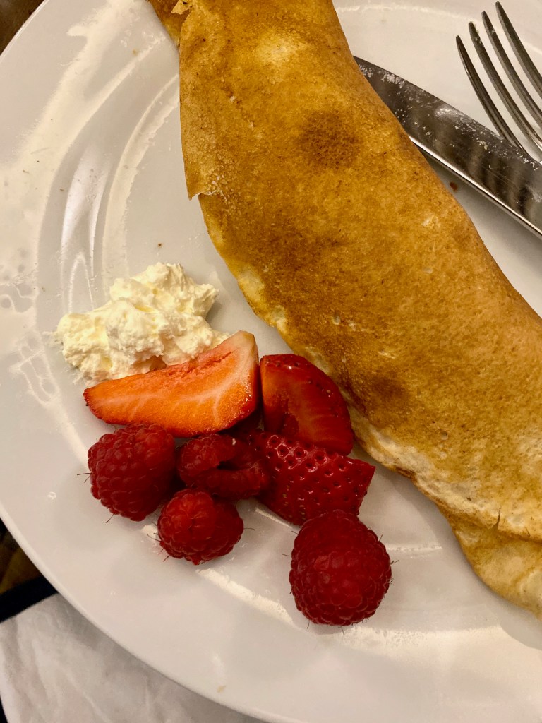 I don’t know how I did it, but I managed four (!) pancakes; two savoury (with ham, cheese and mushrooms) and two sweet ones.