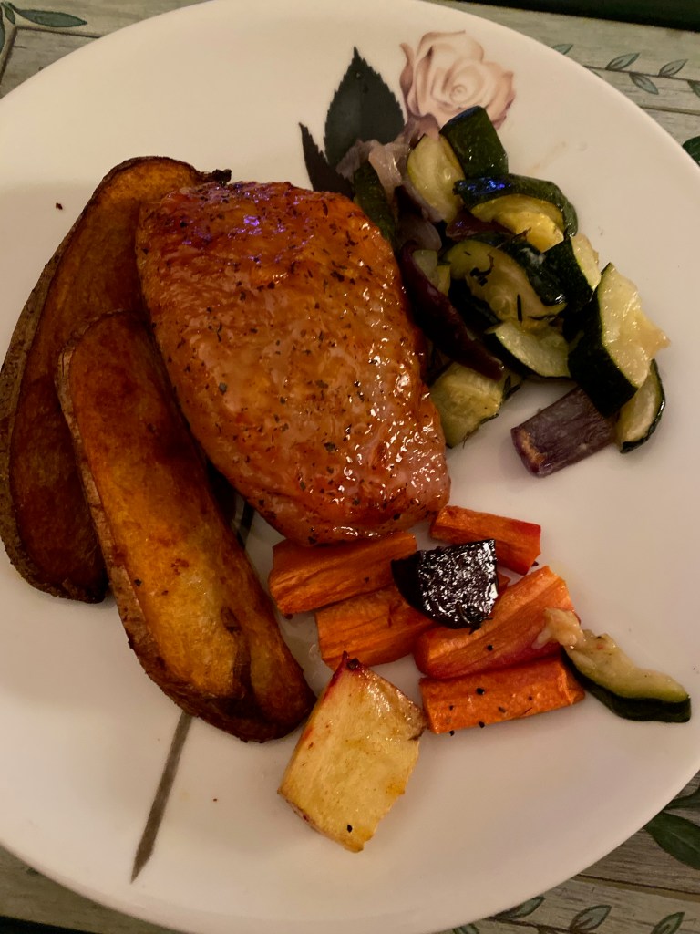 And for dinner I made us a roast chicken with lots of roasted vegetables (carrots, courgettes, tomatoes, broccoli), crumbled feta and tzatziki. So yummy!