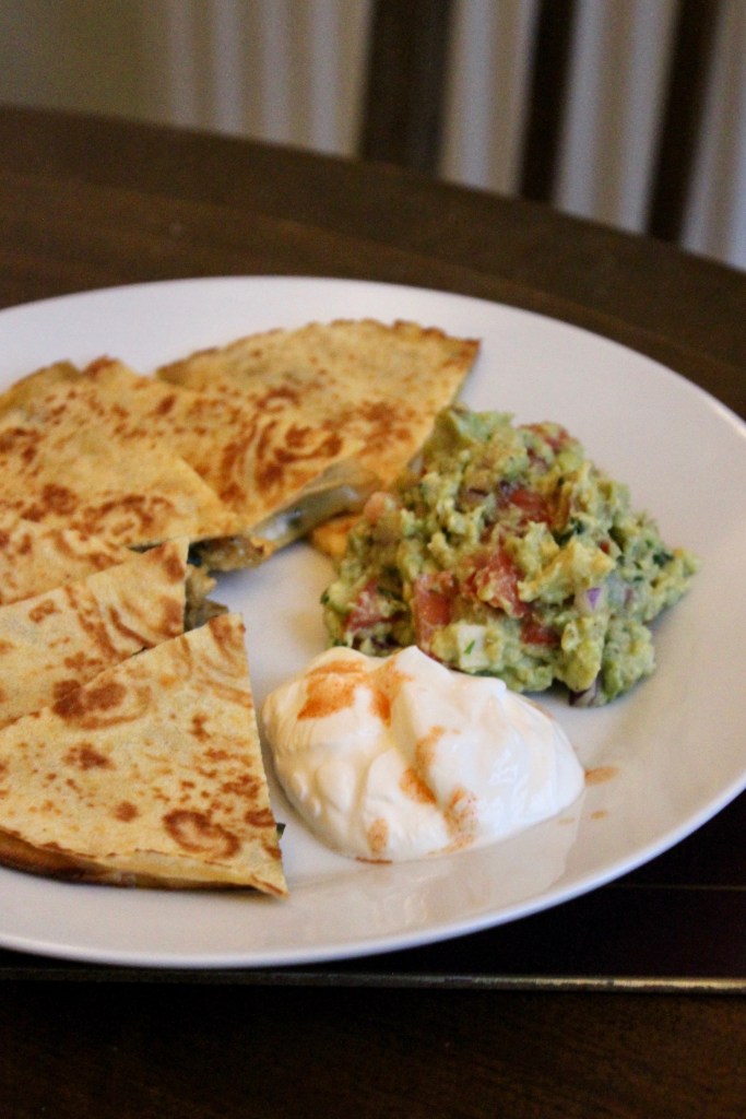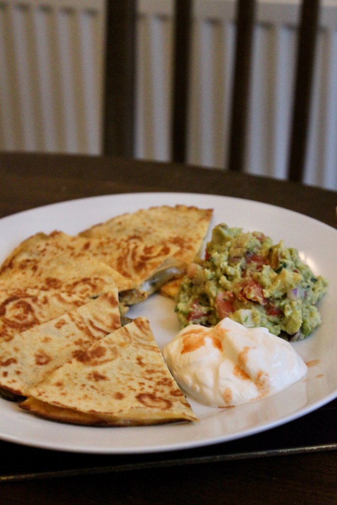 Heat up a clean frying pan on medium heat and add the quesadilla. Fry until side until golden brown while pressing down with a spatula. It only takes a few minutes! Flip the quesadilla over and fry the other side golden brown. Make sure the cheese inside has melted otherwise lower the heat and fry for a bit longer, making sure it doesn’t burn. Remove to a chopping board and cut into six triangles. Serve immediately with guacamole, soured cream and a little hot sauce.
