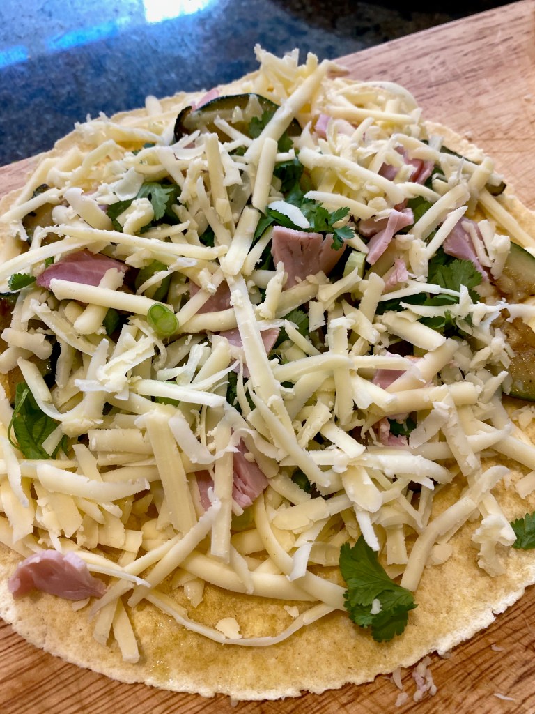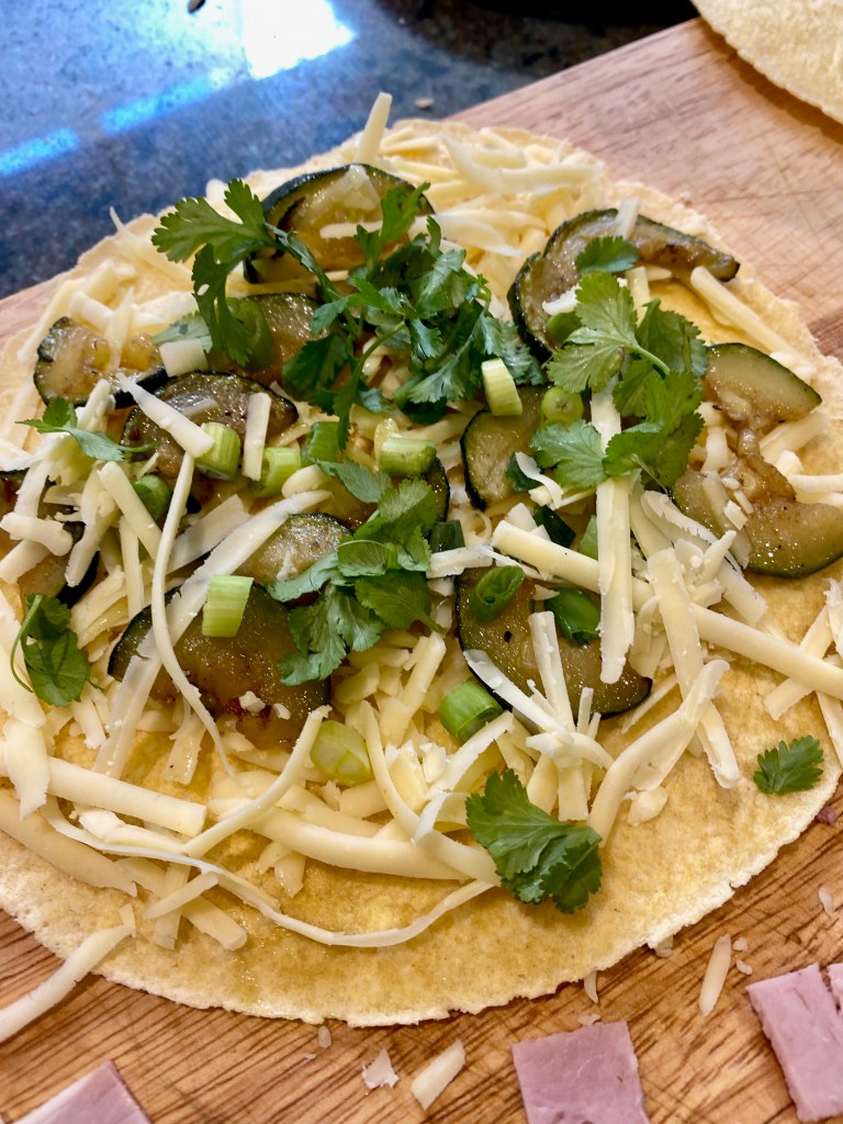 Place three tortilla breads on a flat surface and divide half of the grated cheese between them. Add the fried courgettes, coriander, spring onions and ham and top with the remaining cheese. Place the other tortilla breads on top and press down to flatten with your hands.