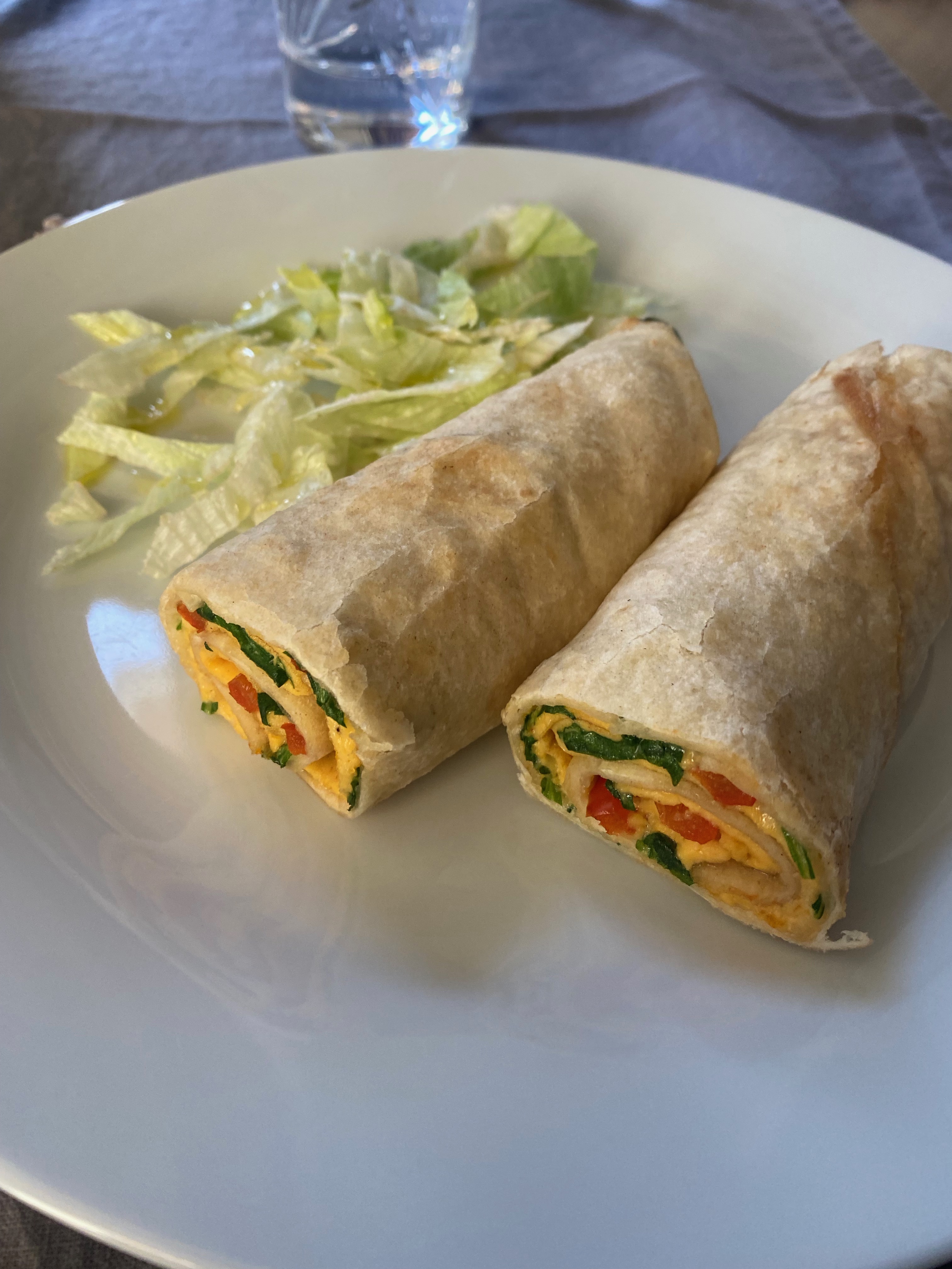 Add a little butter to a small non-stick frying pan on medium heat. Add the washed spinach and push it around until it has been wilted. If there is a lot of liquid in the pan squeeze the spinach to remove the excess water.