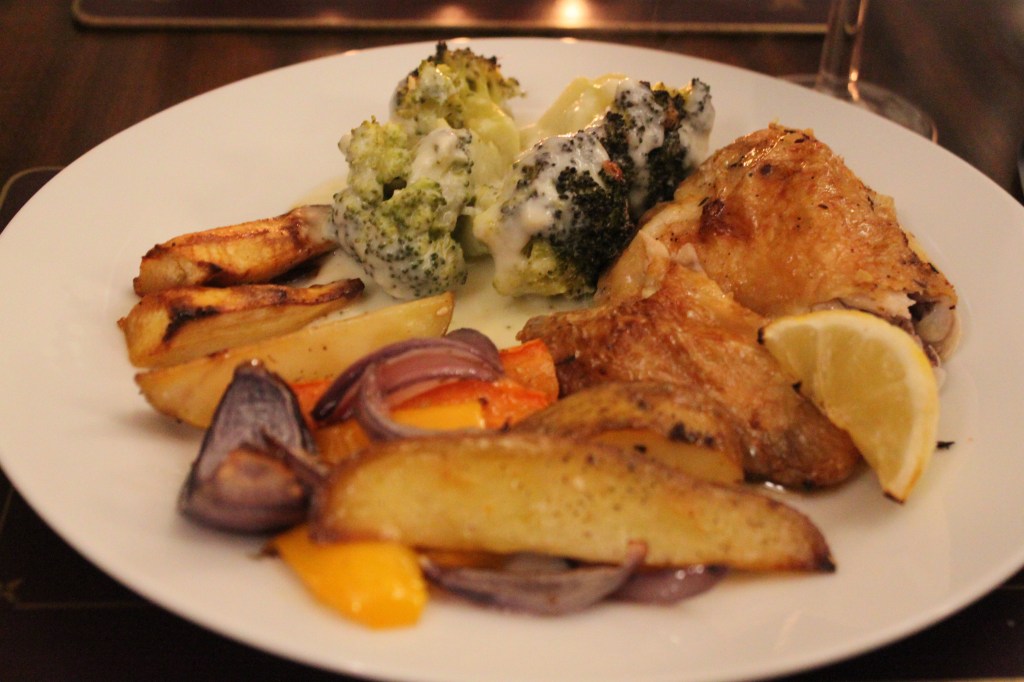 And for dinner I made us a roast chicken with lots of roasted vegetables (carrots, courgettes, tomatoes, broccoli), crumbled feta and tzatziki. So yummy!